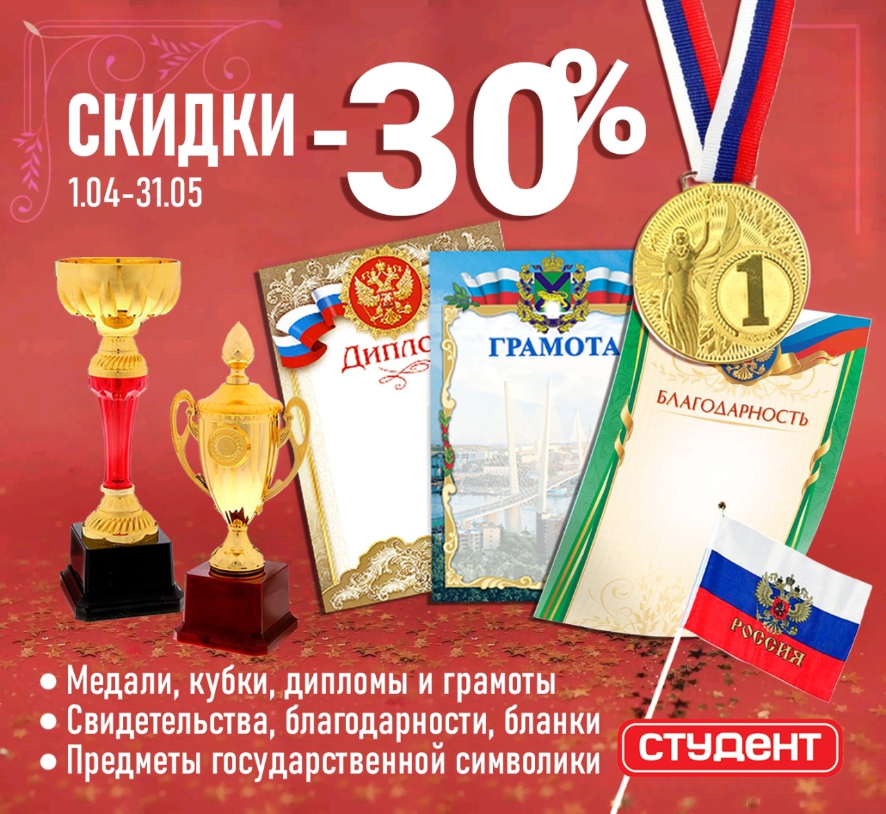 Весь апрель и май в сети розничных магазинов «Студент» — скидка 30% на всё, что сияет и вдохновляет: